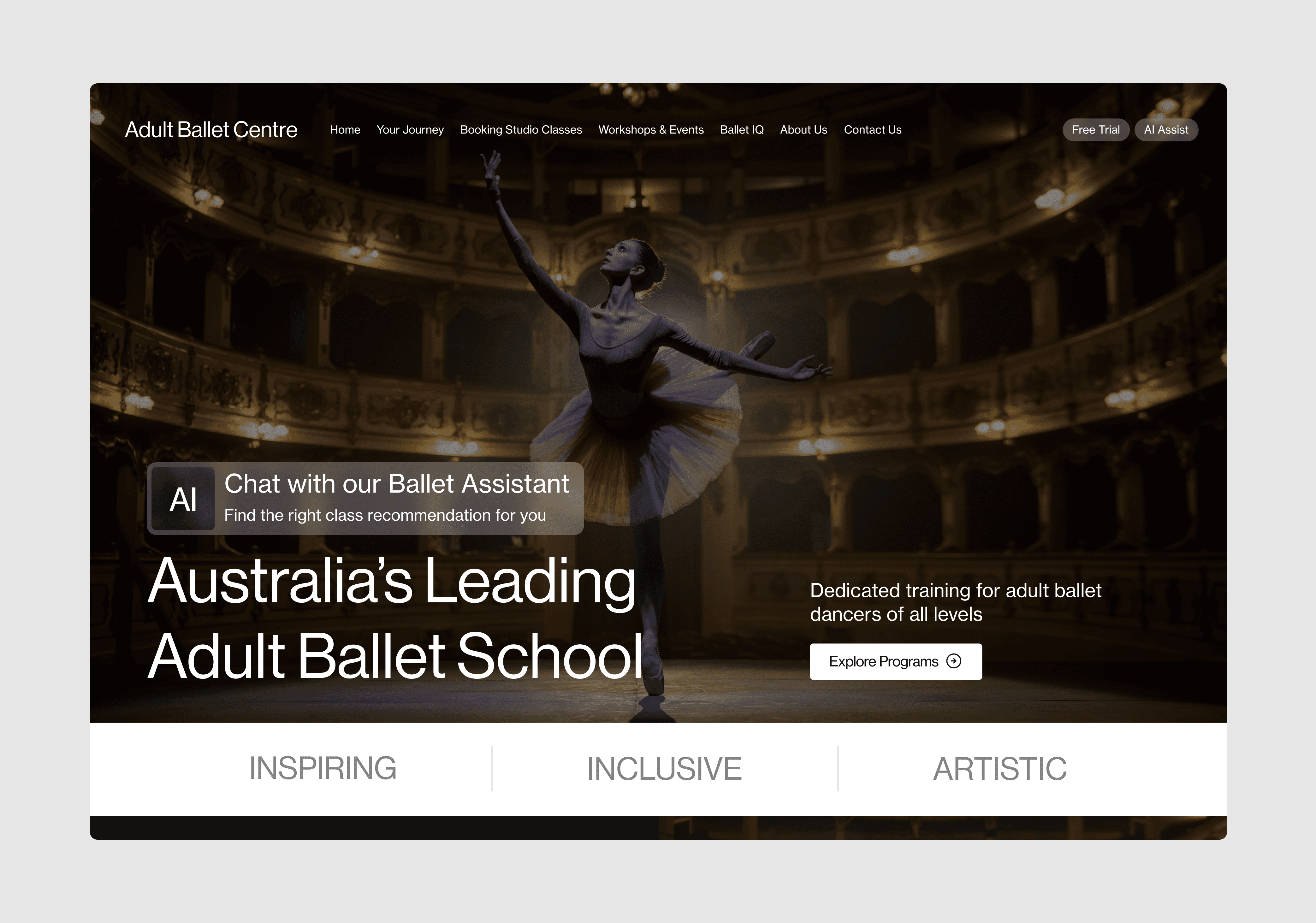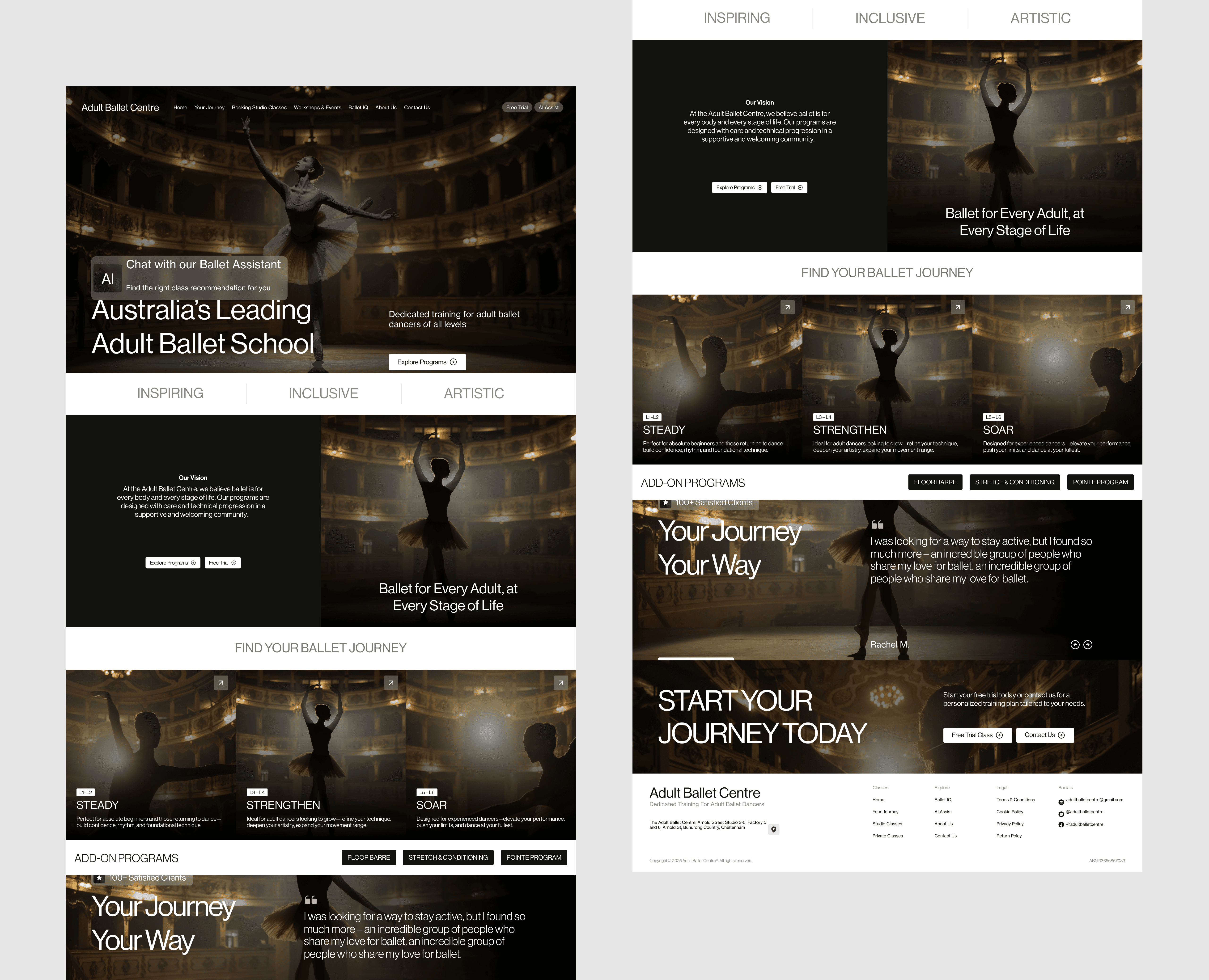 Inconsistent Branding The existing site lacked a cohesive brand identity, reducing visual impact and recognition. Weak Storytelling Content didn’t clearly convey the studio’s unique approach or the value of adult ballet programs. High Bounce Rate Users left the site quickly due to cluttered content and unclear messaging. Lead Generation Goals The client wanted to increase class sign-ups and inquiries, which required a clearer user journey and stronger CTAs.
