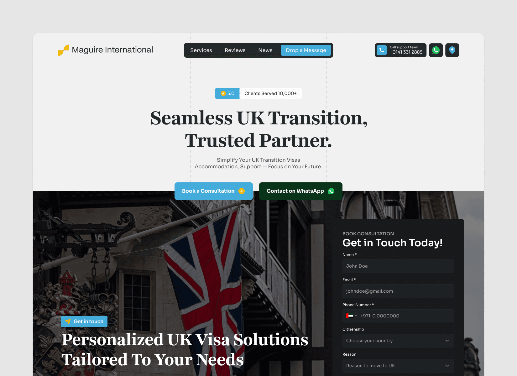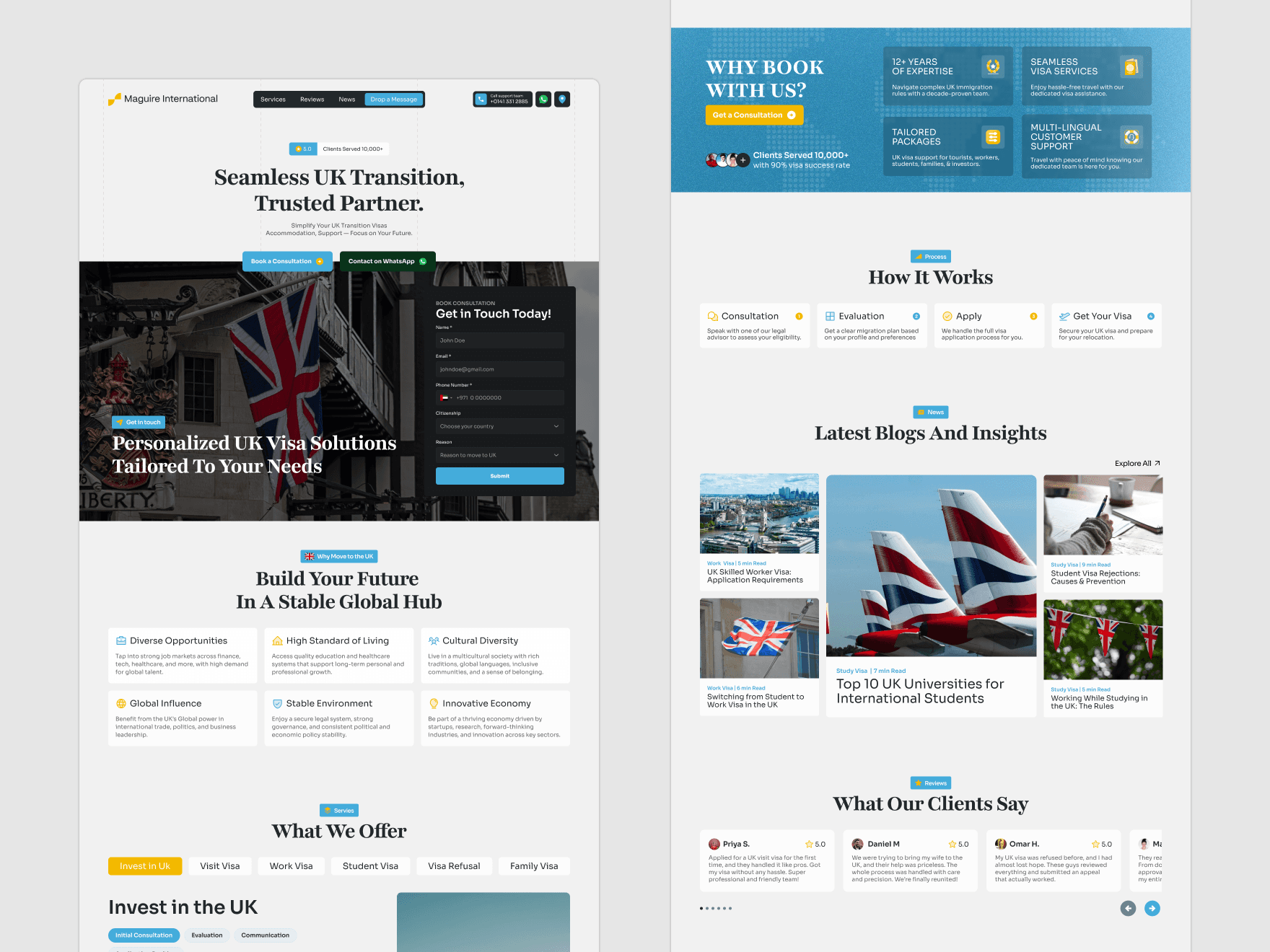 Clear Value Proposition: New design communicates what Maguire offers and how they help instantly. Conversion Confidence: Client expressed high confidence that the redesign will significantly improve conversion rates post-launch. Enhanced Credibility: Stronger first impression, streamlined structure, and benefit-driven content position Maguire as a top-tier visa consultancy.